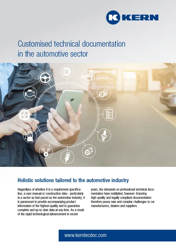 With the rapid technological advances of recent years, the demands placed on professional technical documentation have multiplied – ensuring high-quality and legally compliant documentation therefore presents car manufacturers, dealers and suppliers with new and complex challenges. KERN offers comprehensive solutions specifically for the automotive industry.