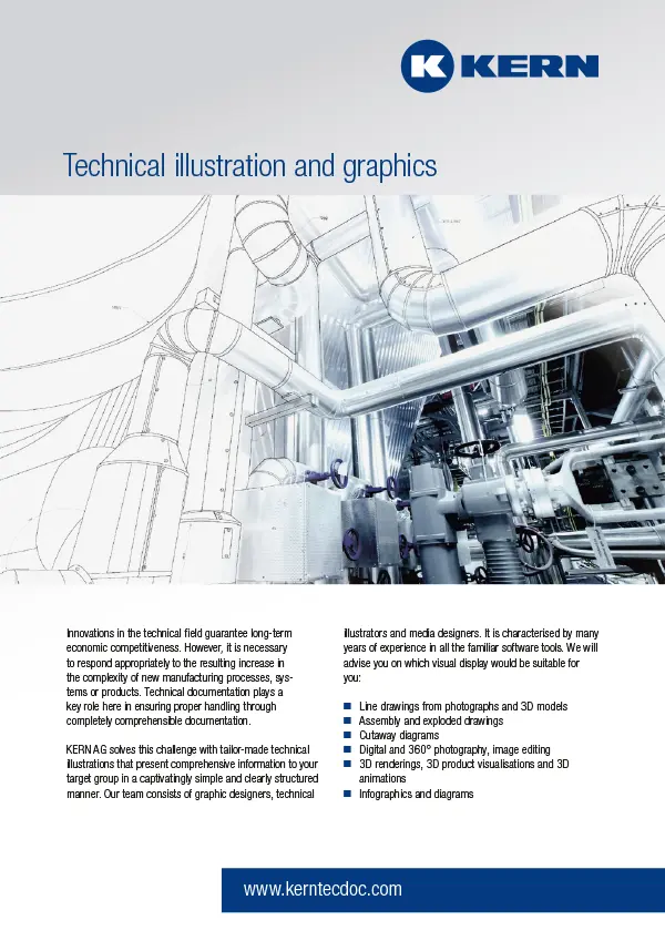 KERN solves the challenge of creating fully comprehensible documentation with tailor-made technical illustrations that present comprehensive information to your target group in a captivatingly simple and clearly structured manner. Our team, consisting of graphic designers, technical illustrators and media designers, has many years of experience in all industry-standard software tools and will advise you on the selection of the ideal visual representation for your needs: