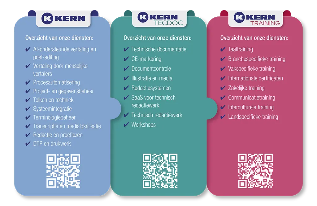 Met meer dan 50 jaar ervaring en meer dan 30.000 klanten staat de KERN Group voor deskundigheid en betrouwbaarheid in wereldwijde communicatie. Het is onze missie om u snelle, hoogwaardige en kostenefficiënte oplossingen te bieden. Hiervoor combineren we branchekennis, moedertaalsprekende communicatie-experts en technische uitmuntendheid. Met meer dan 45 vestigingen wereldwijd staan we dicht bij onze klanten. Op het gebied van trainingen ontwikkelen meer dan 35.000 cursisten taalvaardigheid en internationaal zelfvertrouwen. Samen maken we wereldwijde samenwerking duidelijk, veilig en effectief.